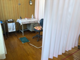 下の写真は、校医先生の検診コーナーです。他の児童から見えないようにカーテンの中に一人ずつ入って検診していただきます。
