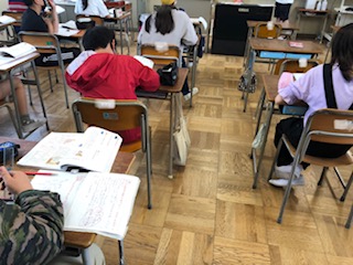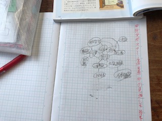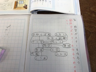 防災ポスターを作るために図を使って考えていきます。一人一人がノートに図を書いています。