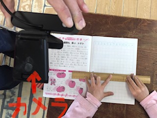 2年生は、この時間に登校している児童がものさしを使って線を引くところを写して学習を進めていました。