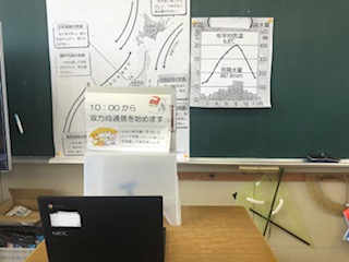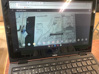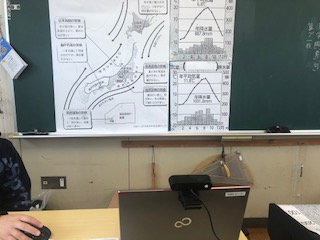 5年生は端末の画面に日本地図を写して気候について学習しました。画面下の◯は接続している子どもたちを表しています。