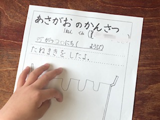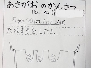 今日はあさがおの観察として、種をまいた時の様子をかきました。学習園のあさがおを見ると、たくさんの芽が出ていました。