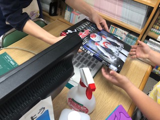 木曜日は学校図書館補助員の方が図書館におられます。本の貸し出しもされています。(写真は、2年生)
