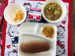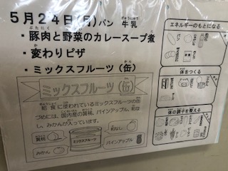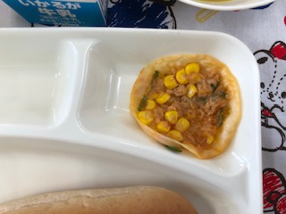 今日の給食には、ピザやフルーツ缶詰がでました。