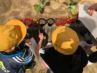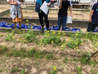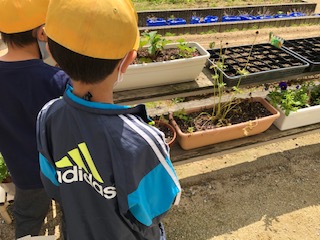 先週まいた種が芽を出しています。今日は観察カードを持って学習園で観察しました。他の植物なども見ていました。
