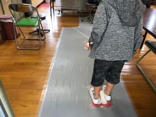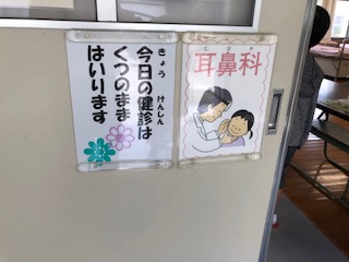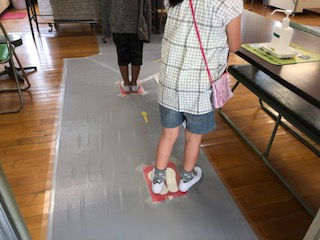 今日は全学年で耳鼻科検診を行いました。保健室の中は間隔を開けて並べるように足形がつけられています。