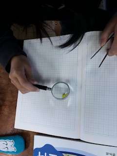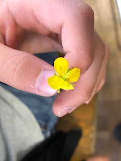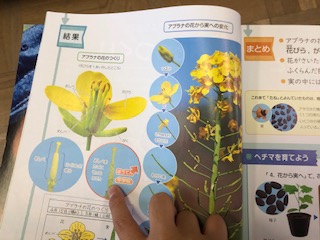 学習園のアブラナがさきました。花のしくみをくわしく観察しました。まず、手に取ったり虫めがねで見たりしていきました。