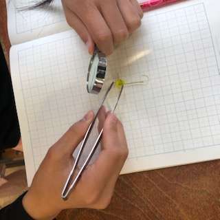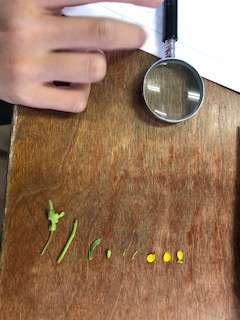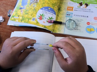 ピンセットを使って花びら、がく、おしべ、めしべなどに分けて観察していきました。子どもたちはうまくピンセットを使って分割していました。