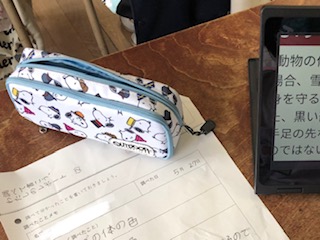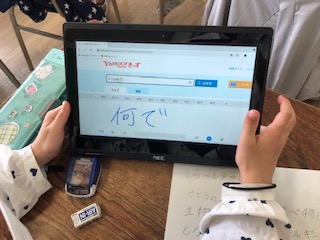 国語科の「調べて書こう、わたしのレポート」の学習では、一人一台端末(パソコン)を使って調べています。調べたいことを画面に手で書いて検索をしています。