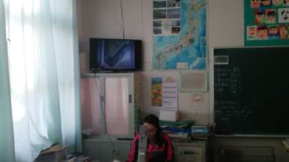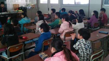 今日は、3年生の様子を紹介します。教員が「ごんぎつね」の読み聞かせをしています。挿絵がみんなに見えやすいように、テレビ画面に映しています。3年生の子どもたちは画面を見ながら聞き入っていました。