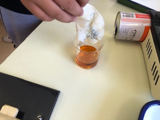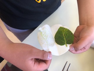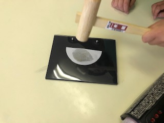 ろ紙にはさんだ葉を木づちでたたきます。ろ紙には葉に含まれているものがろ紙につきます。そのろ紙をヨウ素につけます。