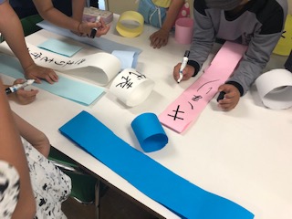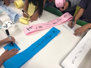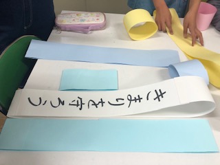 4年生、5年生、6年生の各クラスの代表による代表委員会の活動の様子です。今日の休み時間に「きまりをまもろう」のタスキを作っていました。