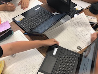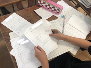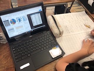 都道府県についての新聞を作っています。一人一台端末を使ったり、クラスのみんなにアンケートを取ったりして調べました。