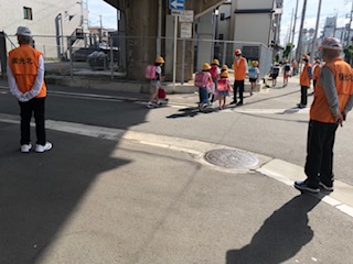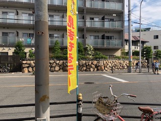 毎月7日は、東淀川区の見まもるデーです。学校や信号のあるところなどに黄色い旗を立てています。