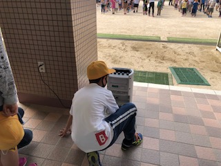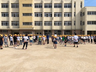 運動場で児童朝会を行っています。放送委員会の子どもたちが集合や退場の音楽をかけています。