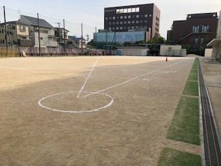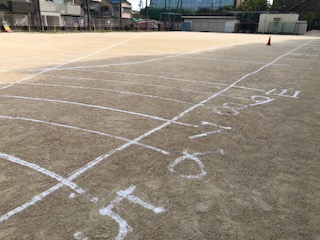 明日、スポーツテストを行います。運動場には、ソフトボール投げの線がかかれました。