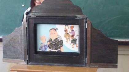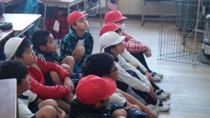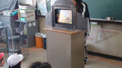 今日は4年生の様子を紹介します。先生が紙芝居の読み聞かせをしています。紙芝居は6年生でも興味をもって聞きます。もちろん、4年生の子どもたちは楽しそうに聞き入っていました。