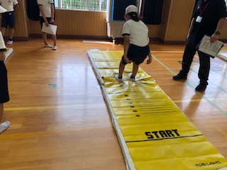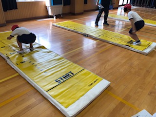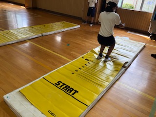 立ち幅跳びです。目盛りのついたマットを使っているので効率よく正確に測定することができます。
