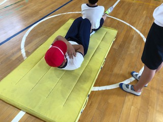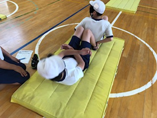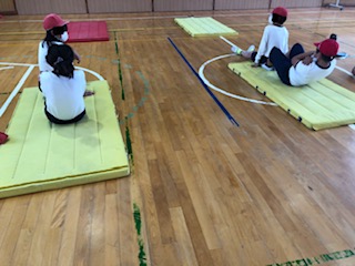 上体起こしをしています。起き上がる児童は手を胸の上で組んでいます。