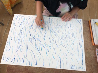 パスを使って自分の思いの「雨」を画用紙に描いています。