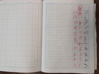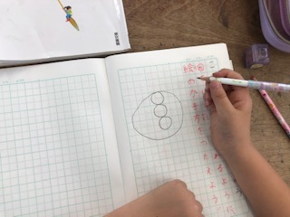 この話を聞きながら子どもたちが串だんごの絵をノートに描いていきました。