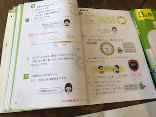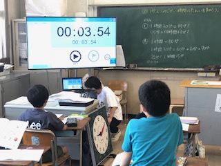 時間と分、秒との関係などを学習しています。教科書に載っている「十二支」を早口で言う時間を例に出して「秒」の理解につなげていきます。実際に十二支を言う時間をはかりました。(ね うし とら う たつ み うま ひつじ さる とり いぬ い)