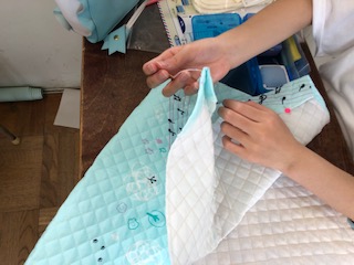 家庭科でナップサックを作っています。この時間は、ひも通しの部分などのしつけ縫いをしています。
