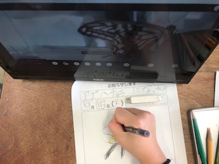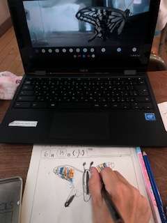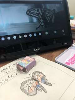 端末画面のアゲハチョウを見て、観察カードに絵をかいていきます。