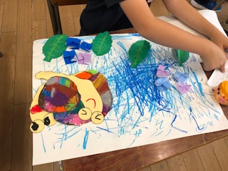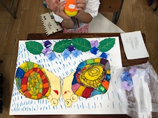 パスで雨をかいた絵に、作っていたかたつむりやあじさいを貼りました。梅雨の季節らしいすてきな作品ができました。