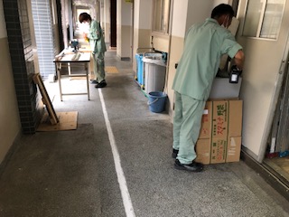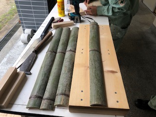 管理作業員が木と竹とを加工して何かを作っています。何ができるか楽しみです。(玄関に飾ります)