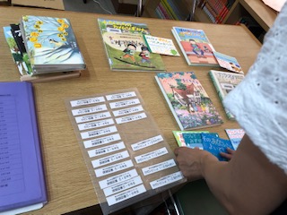 学校図書館補助員の方が届いた課題図書の貸し出しの準備をしています。