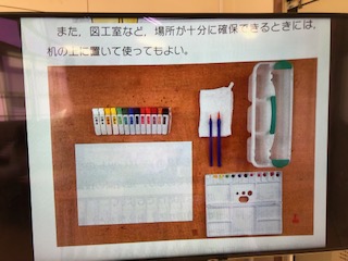 用具の名前や机の上への置き方を電子黒板を使って説明した後、赤色の絵の具をパレットに置いて線を引いてみました。