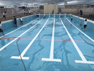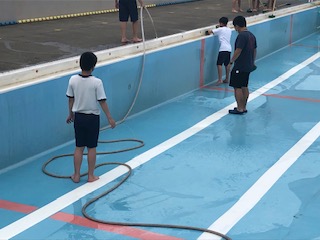 運動委員会では、担当教員といっしょにプールそうじをしました。(水着ではありませんので写真を撮影しています。水泳の時はプールでの撮影はしていません。)
