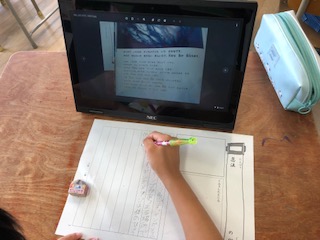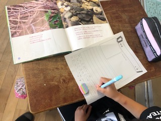 昨日、授業研究会をした3年生は、昨日の続きをしています。本やタブレットを使って生き物の保護色などについて調べています。