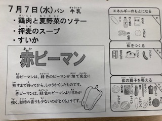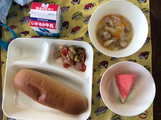 今日の給食には、夏にふさわしいすいかが出ました。赤ピーマンとすいかの赤色が目に飛び込んできます。