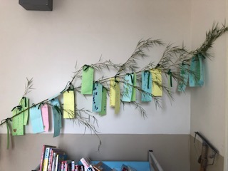 2年生の廊下にも短冊をつけた七夕飾りがありました。この笹も幼稚園からいただきました。ありがとうございました。