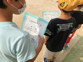 クラスごとに表彰状の内容は違っています。「ぞうきんをきれいにあらっているで賞」「ろうかがきれいで賞」「ぞうきんがけがきれいで賞」など、美化委員の子どもたちがそうじについてよく見ていることがわかります。