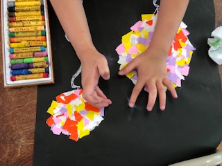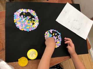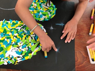 夏にふさわしい図工です。色の紙をはって花火を作っています。まわりにはバスをぼかして空全体を表現しています。