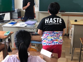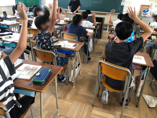 英語での時間割、科目の読み方について学習しています。担任も英語で質問して子どもたちも英語で答えています。