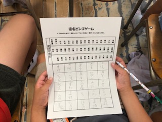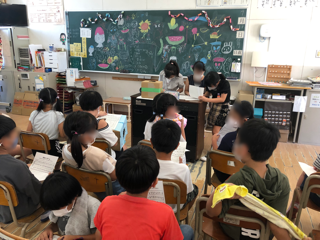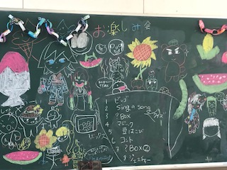 黒板には、お楽しみ会のメニューや飾りがかかれています。県名のビンゴゲームも用意されています。