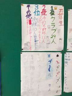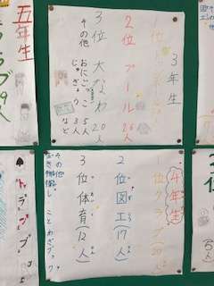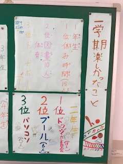 新聞委員会の子どもたちがクラスごとにアンケートをとって集計しました。1学期楽しかったことを学年別に新聞にまとめて掲示しています。学年ごとに楽しかったことが違うのにも興味が持てます。