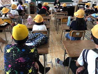 今日は台風を想定した避難訓練をしました。集団下校で帰るため、集団登校の地区ごとに集まって地区子ども会を行いました(中と下の写真)