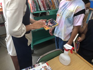 (上の写真)学校図書館補助員の方が本を消毒して子どもたちに手渡しています。