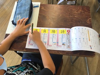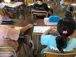 (写真上)手を挙げているのは漢字の書き方を手で確認しているところです。