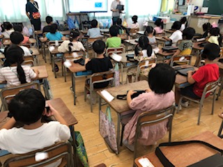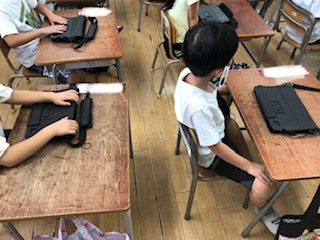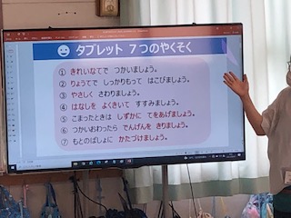 いよいよ1年生もタブレット端末を使う日が来ました。今日はICT 支援員の方(中の写真)がいろいろと教えてくださいました。子どもたちはしっかりと話を聞いています。