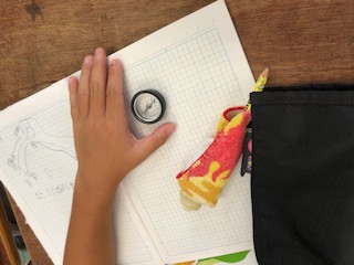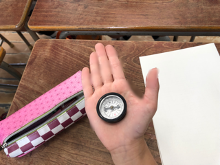 方位磁石を手に取って学習しています。(指先などはモザイク処理しています)