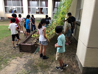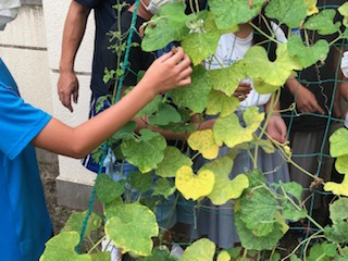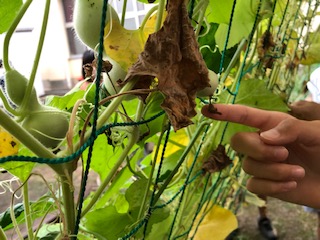中庭のヒョウタンの花が咲き、実をむすんできています。今日は近くで観察しました。