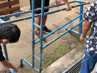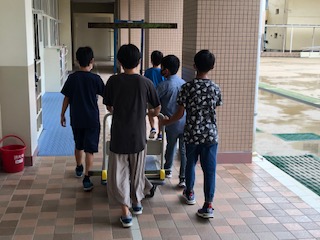 運動委員会では体育用具の整理もしていきます。一輪車のスタンドを移動しています。