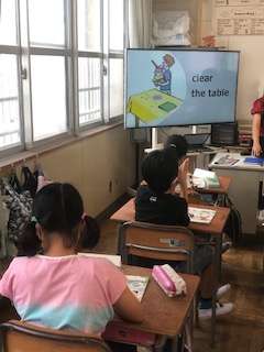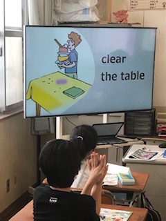 ネイティブの英語を話すC-NET(電子黒板の横におられます)の英語を聞いています。
