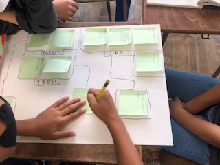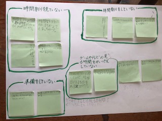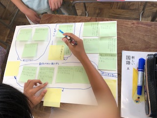 話合い活動をしています。話し合ったことを付箋に書いてグループで内容ごとにまとめていきます。