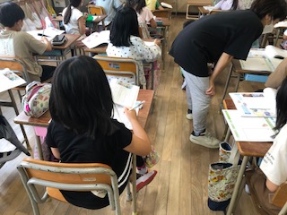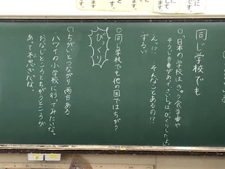 「同じ学校でも」の題での道徳の授業です。ハワイと日本の小学校との違いを知ると共につながりの深さも学びます。